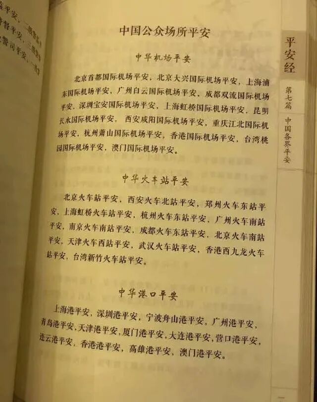 尽管本人无缘亲睹神书,但从各种媒介介绍的情况,也对该书有了大致了解。这书确实神,确实奇。整本书全部以“XXX平安”造句,“西安火车站北站平安、郑州火车站东站平安、上海虹桥火车站平安,耳平安,鼻平安,男平安,女平安,1岁平安,2岁平安,英吉利海峡平安,塞浦路斯平安……”。