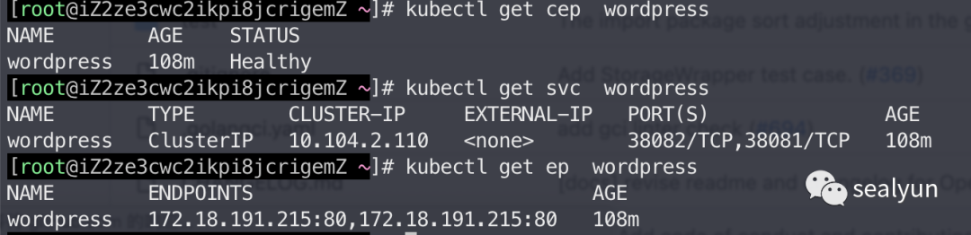 apiVersion: sealyun.com/v1beta1kind: ClusterEndpointmetadata:creationTimestamp: "2022-01-18T13:44:08Z"generation: 1name: wordpressnamespace: defaultresourceVersion: "610358"uid: 41303de7-9706-487a-8204-79a3a358730fspec:hosts:172.18.191.215periodSeconds: 10ports:failureThreshold: 3name: httpsport: 38082protocol: TCPsuccessThreshold: 1targetPort: 80tcpSocket:enable: truetimeoutSeconds: 1httpGet:path: /scheme: httpname: httpport: 38081protocol: TCPtargetPort: 80status:conditions:lastHeartbeatTime: "2022-01-18T13:44:08Z"lastTransitionTime: "2022-01-18T13:44:08Z"message: cluster endpoints has been initializedreason: Initializedstatus: "True"type: InitializedlastHeartbeatTime: "2022-01-18T13:44:08Z"lastTransitionTime: "2022-01-18T13:44:08Z"message: sync service successfullyreason: SyncServiceReadystatus: "True"type: SyncServiceReadylastHeartbeatTime: "2022-01-18T13:44:08Z"lastTransitionTime: "2022-01-18T13:44:08Z"message: sync endpoint successfullyreason: SyncEndpointReadystatus: "True"type: SyncEndpointReadylastHeartbeatTime: "2022-01-18T13:44:08Z"lastTransitionTime: "2022-01-18T13:44:08Z"message: ClusterEndpoint is available nowreason: Readystatus: "True"type: Readyphase: Healthy