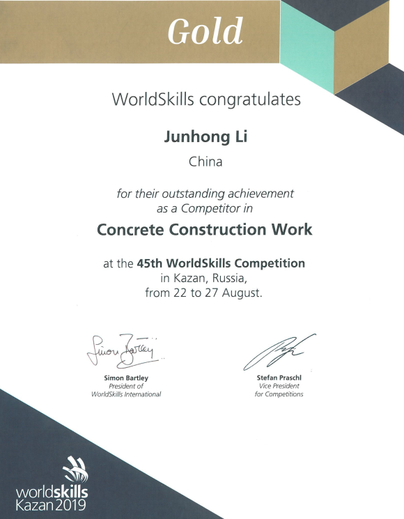2019年8月22—27日,第45届世界技能大赛在俄罗斯喀山举行。李俊鸿和队友在长达4天的比赛中,用商品混凝土砌筑出的高标准、高精度、高颜值的建筑作品,展示了中国商品混凝土建筑的水平,获“第45届世界技能大赛”混凝土建筑项目金牌。