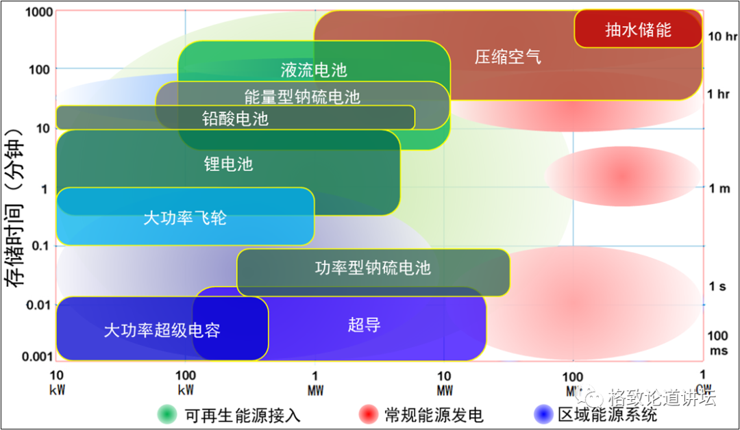 不同的储能技术有不同的性能特点。从左图中,可以看出不同储能方式的储存时间和功率有各自的适用特点。同时,从右图中可以看到整个电网对储能的需求也不同,也就说对储能有着不同的性能要求。