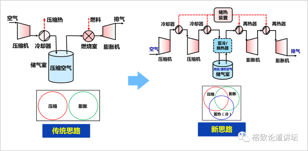 究其原因主要有三个方面。一个就是空气在压缩过程中产生的压缩热没有回收。我们在生活中有这个感受:用气筒给自行车打气的时候,气筒会发热,这个就是压缩热,而传统空气储能系统没有回收压缩热。其次,空气的储能密度比较低,所以需要大规模的储气装置。第三,压缩、膨胀等系统过程相互独立,使得它的总体效率不高。