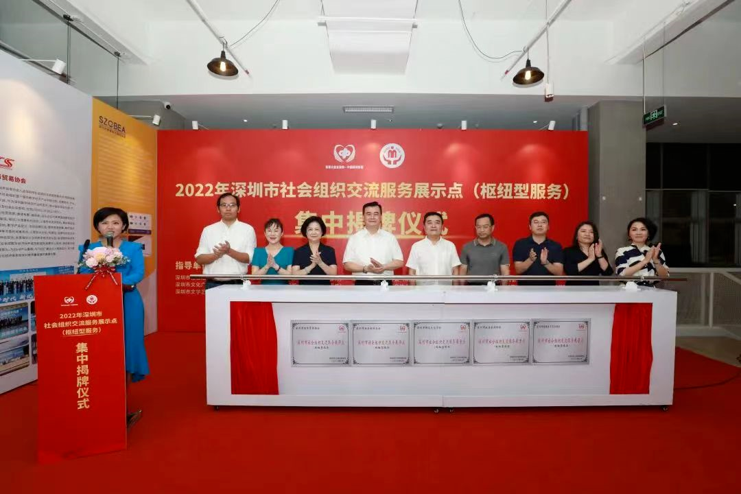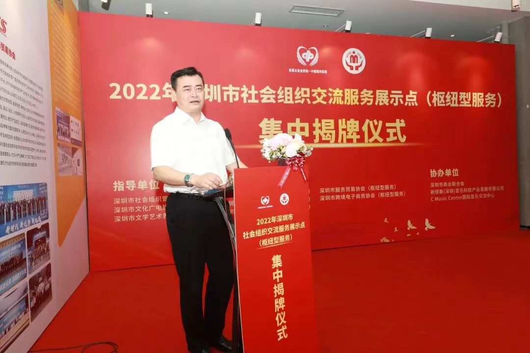 9月20日,深圳市群众文化学会、深圳市社会组织总会、深圳市政府采购协会、深圳市服务贸易协会、深圳市跨境电子商务协会等五个枢纽型社会组织交流服务展示点在南山区C Music Center国际音乐交流中心集中揭牌。市文学艺术界联合会党组成员、专职副主席张晋文,市社会组织管理局副局长白凌,市文化广电旅游体育局公共文化服务处处长聂昌友,以及相关社会组织负责人出席揭牌仪式。