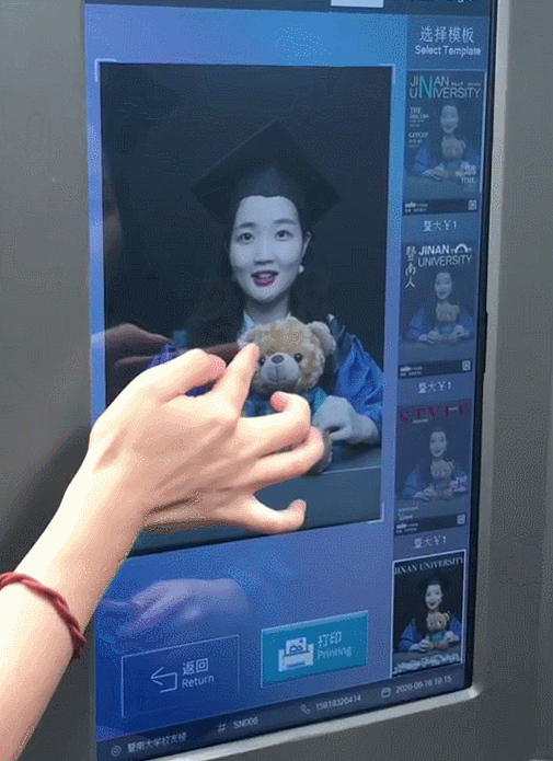 5.打印照片前,可以在屏幕上手动调整人像大小和位置,微信扫码之后就能打印你选中的照片啦。暨南人拱门主题模板照片一张只需0.99元。(动图价格仅为操作示意,非正式价)