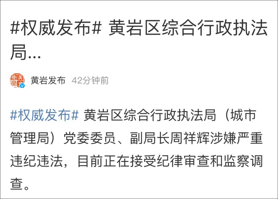 今天上午,微博@黄岩发布 通报称,副局长周祥辉因涉嫌严重违纪违法,正接受调查。