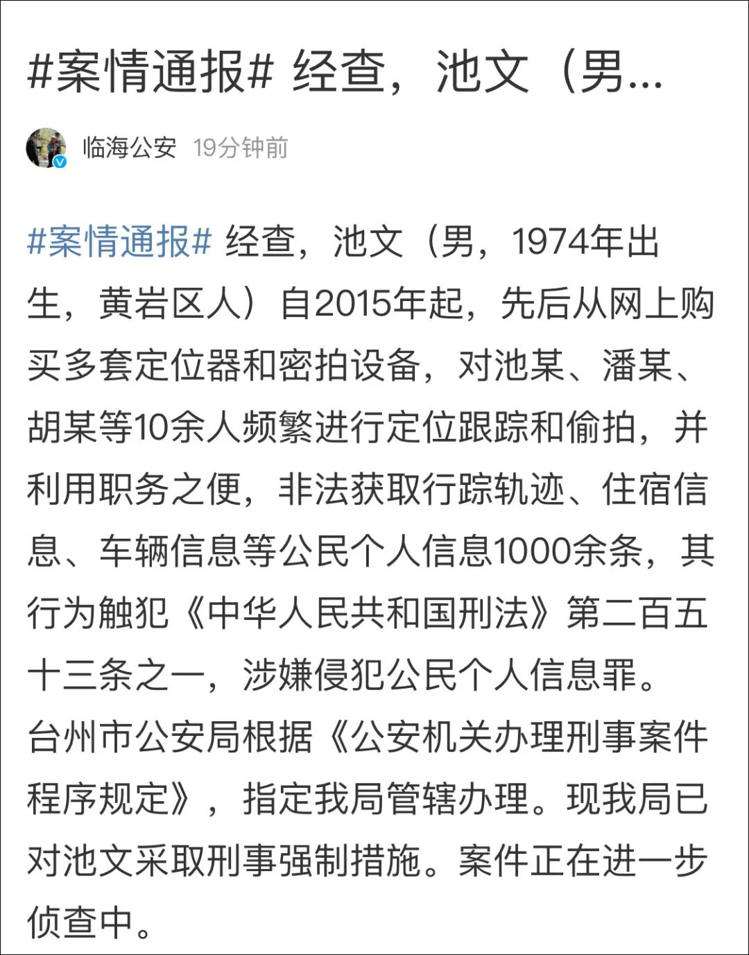 同样是今天上午,@临海公安 官方微博通报称,原民警池文利用职务之便,定位跟踪、偷拍10余人,非法获取个人信息,涉嫌侵犯公民个人信息罪,公安机关对其采取强制刑事措施。