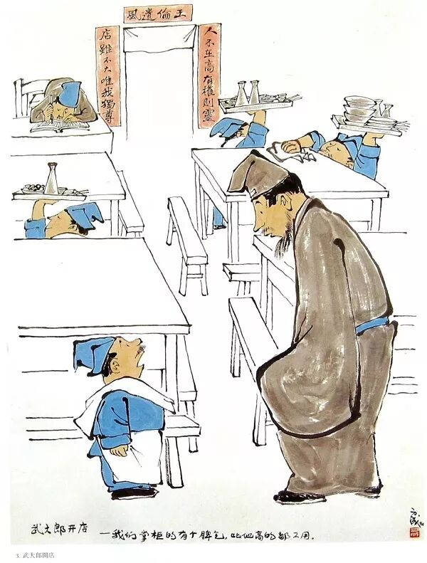 脍炙人口的《武大郎开店》在画展中引起极大反响,漫画巧妙的运用了中国优秀古典小说《水浒传》中的人物,卖烧饼“个体户”——武大郎。漫画家保留了他的“专利”——身材短小,而让他“荣升”为老板,并且老板“有个脾气,比他高的都不用。”借古讽今,尖锐地批评了中国社会中妒才、坑才的恶习。打这以后,“武大郎开店”成为批评妒贤妒能的新语在民间广为流传,足见其影响之大。