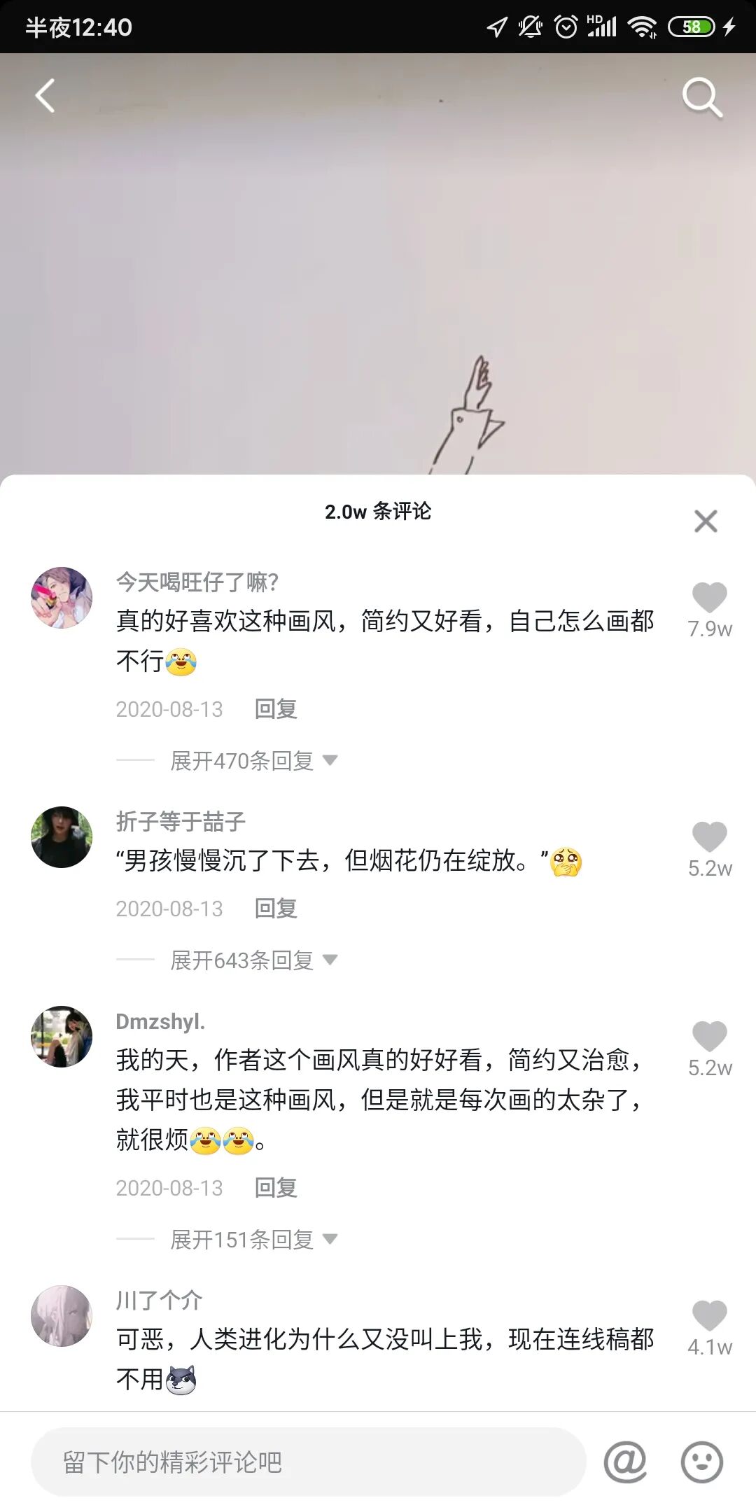 阿又一天,大家平时直接叫他阿又。他是近几年在抖音和全民小视频上声名鹊起的新晋画师。光作品的留言有时候点赞就好几万