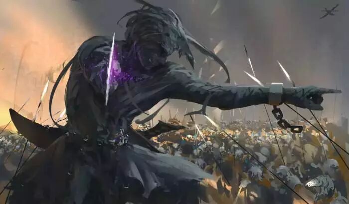 “捡起你的头颅,为我而战吧”,这句经典的对白就是对应鬼刀的能力。他能用刀召唤死灵,组成不死军队。当他的刀刃和眼睛散发着紫光,正是死而复活的时候。为了抑制自己强大的力量,他将双手套上枷锁。