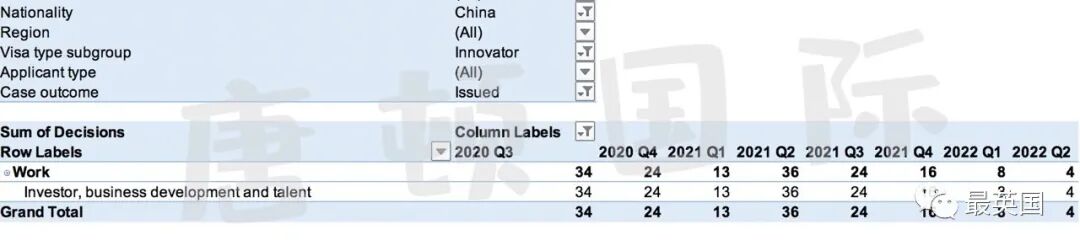 可以看出,从海外申请英国本土innovator visa的审理获批人数,从2021年第四个季度就开始减少,2022年第一季度变成8人。到了2022年第二季度进一步下降为4人(还有1人被拒)。