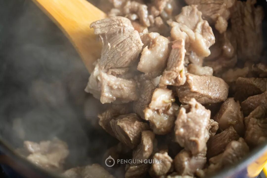 羊肉身上会带一些肥肉,不要扔,留着煎出油,可以让整锅饭再香上一层楼。