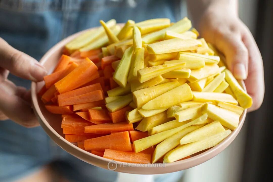 1、胡萝卜150g,黄萝卜300g。切成食指指节大小备用。