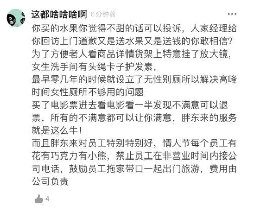品一品该企业的豪情壮志:“让我们这里成为商品的博物馆、商业的卢浮宫”这家超市叫胖东来,只在河南省内经营,不但不扩张,甚至还主动闭店,堪称超市界的茶颜悦色,规模肯定比不上家乐福大润发这种巨头。然而这次疫情,胖东来居然捐了5000万!有网友说,这笔钱拿出去扩张都都够嘞……在微博豆瓣搜胖东来,更多是为这家超市打call的河南网友。了解了一下,我们发现这家超市真的很神奇!