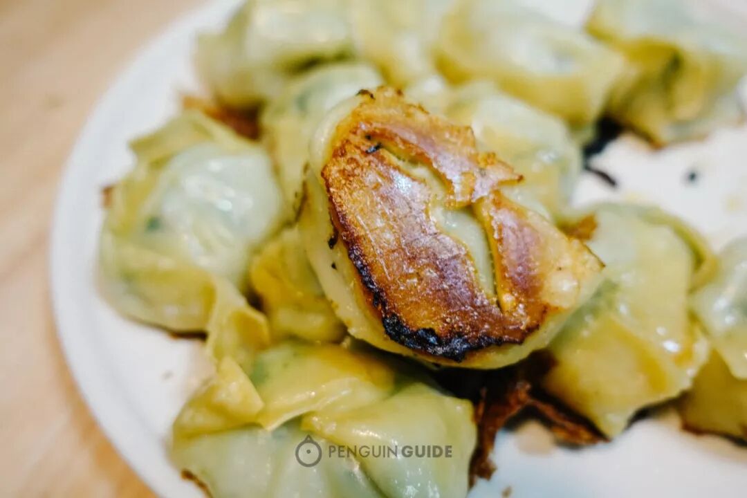 掀开锅盖,你就可以看到带着这样一层脆脆焦边的水煎馄饨。有油煎的香,面皮是类似于蒸熟的柔韧口感,翻开底面是这样金黄香脆的焦面,用油还少,完全没有负罪感。升级一点的吃法,是和嵊州人民学到的,叫“抱蛋煎饺”。