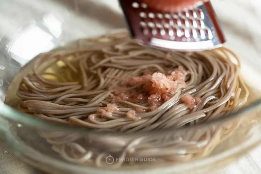 我们选了(相对健康1点)荞麦面,btw,有荞麦面爱好者推荐国产金龙鱼的荞麦干面,有51%荞麦粉含量,胜过不少日本品牌,还便宜,性价比之王。面条浸泡在蘸汁中,再将冷冻番茄用刨丝器擦碎,就是番茄冰沙浇头!沁爽的酸甜味让蘸汁调味原地拔高了好几个度,更鲜,是一种更富有层次感,明快轻盈的鲜甜。面条还能恰好挂住些许番茄冰沙,带些微的颗粒感,有趣!加一小勺橄榄油,磨点黑胡椒更妙,恰好的微辛在舌苔上游走。一碗素面,冰凉得正好,是无论多酷热的夏日都可以捧着,哧溜哧溜个精光的味道。