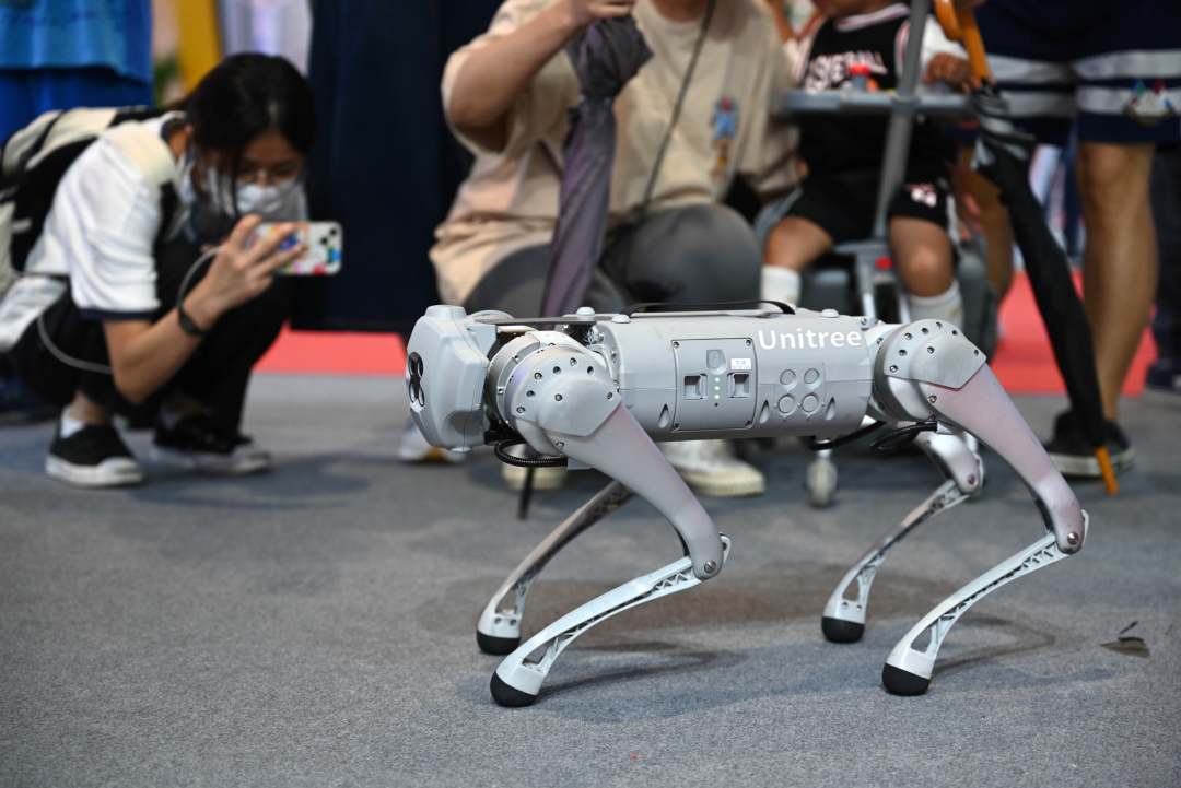 机器狗吸引了大批观众驻足,它能做出上楼梯、打滚儿等动作。