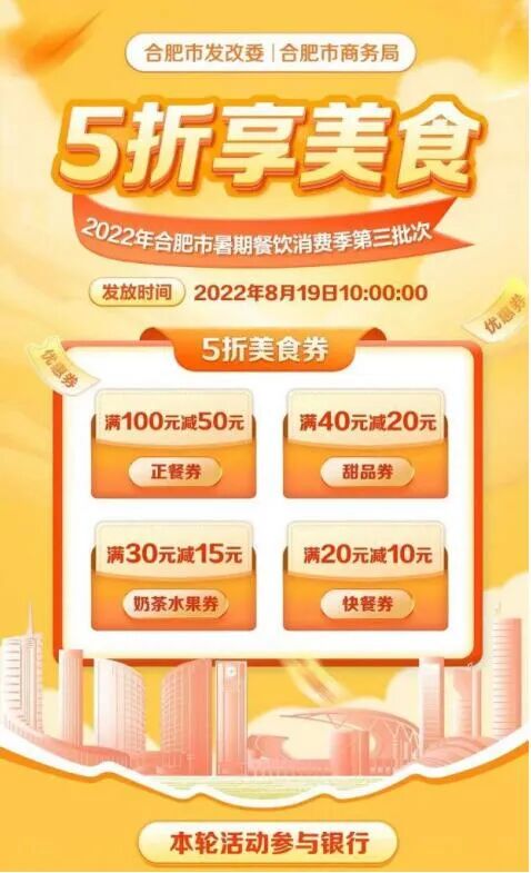 合肥也于8月19日开始发放暑期消费季第三批消费券,共计1844万元。据了解,此次发放的是餐饮消费券,分为满100元减50元正餐券、满40元减20元甜品券、满30元减15元奶茶水果券和满20元减10元快餐券,采取电子券形式发放,消费者可通过登录多家银行APP领取。