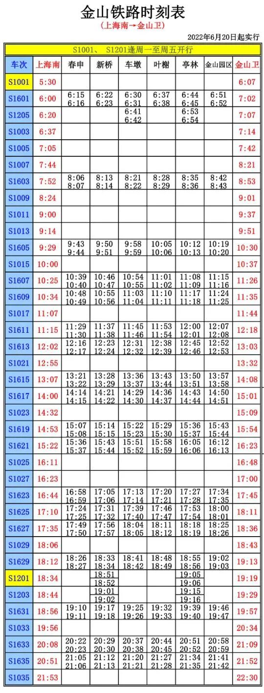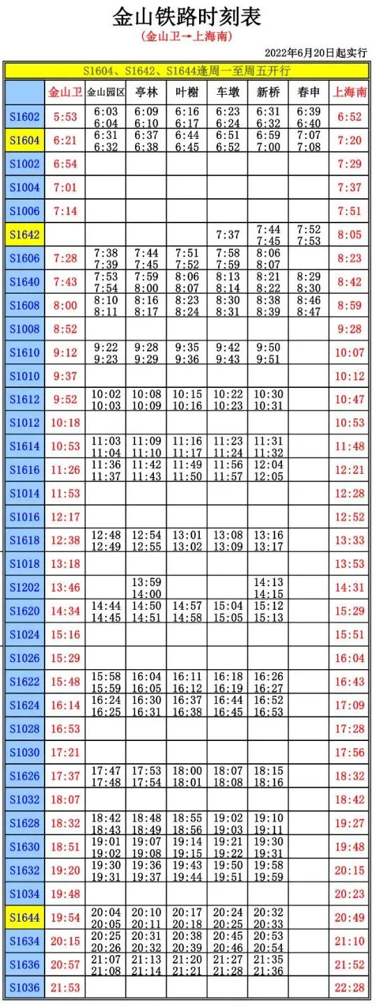 金山铁路2022年中秋小长假列车开行方案公布:9月12日(周一)实行节假日方案;往上海南方向列车S1604(站站停)、往金山卫方向列车S1001(直达)等车次停运。