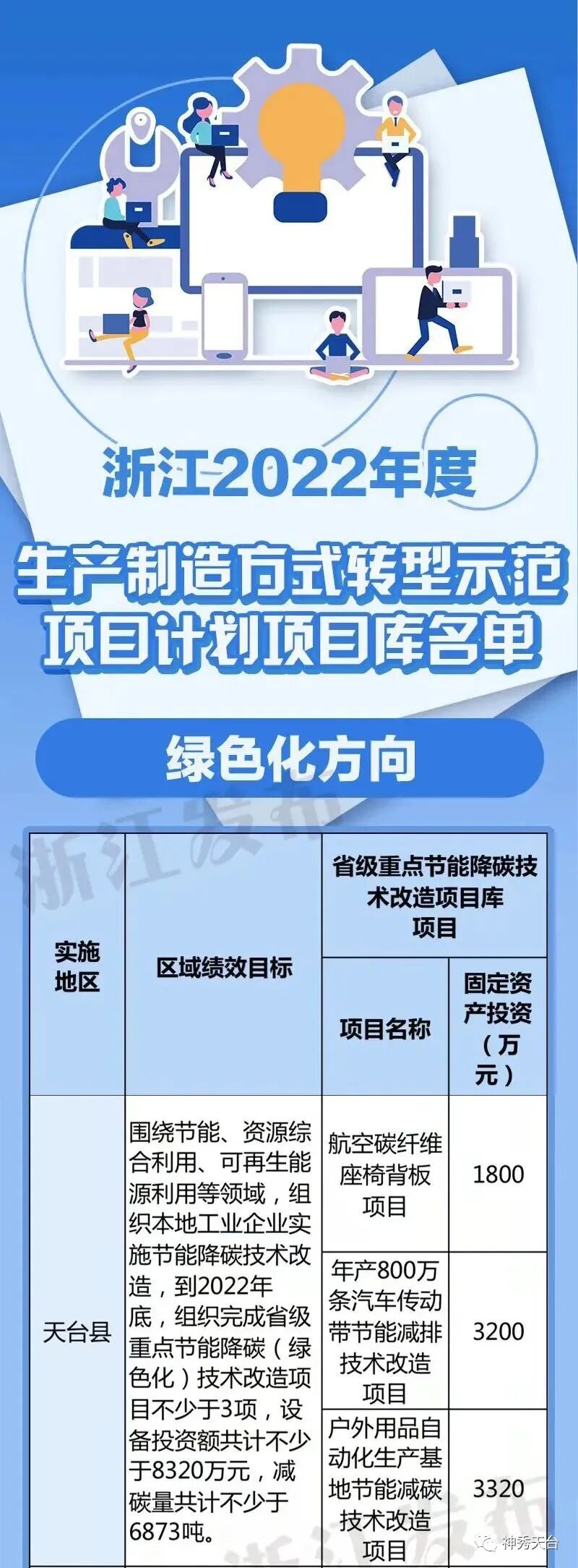 天台县航空碳纤维座椅背板、年产800万条汽车传送带节能减排技改和户外用品自动化生产基地节能减排技改3个项目入选2022年度生产制造方式转型示范项目计划实施名单(绿色化方向),共获得专项资金补助690万元,预计可减少碳排放6873吨。