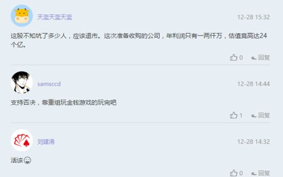 “这股不知坑了多少人,应该退市。这次准备收购的公司,年利润只有一两千万,估值竟高达24亿!”