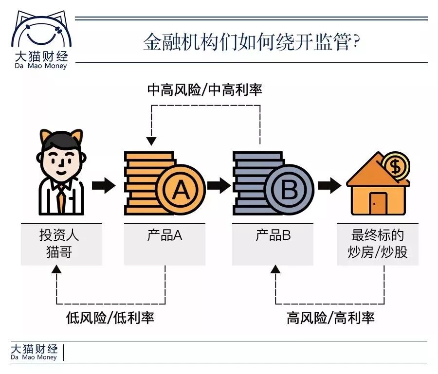 于是,他们就采取了期限错配的方式,也就是用短期资金,不断的续,去购买长期资产。比如说用3个月的短期理财产品的资金去配置3年的地产融资项目,3个月的短期理财产品快要到期了,就发新的产品接上,不停的续,连着续12次,不就接上了嘛。到时候,风险神不知鬼不觉,机构就把钱给赚了。