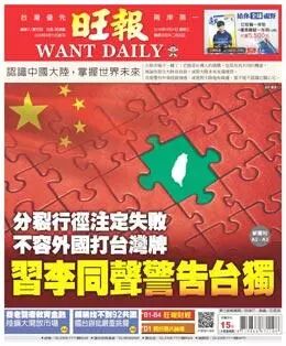 每天八个版面报道“两会”相关内容的台湾《旺报》,头版整版配图大标题展示习、李讲话的核心,国旗拼图上大红底色上唯有一块拼图是绿色台湾,配上《分裂行径注定失败不容外国打台湾牌 习李同声警告“台独”》的标题,十分醒目,诉求统一的意涵十分明显。内页则有《反独最强音习:寸土不分割》等多篇文章,对两会进行细致观察,分析习李讲话剑指美国方面通过的所谓“台湾旅行法”。《旺报》的文章如实摘抄了大陆领导人涉台发言的全部内容,并且特别点出了习近平短短不到300字的涉台内容发言,却获得四次如雷般掌声的细节。《旺报》还专门访问了多位大陆学者,认为今年两会的对台内容,必须与国台办日前颁布的惠台政策31条联系在一起看,因为推出并落实这些惠台政策,是促进两岸同胞心灵契合的重大工程。