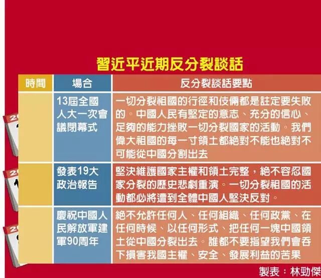 此外,《联合报》《经济日报》等几家台媒还采访了多位大陆涉台学者,并专门制作了习近平近年来涉台讲话的对比表格,认为昨天关于台湾的谈话措辞和语气都堪称是近年来最重的一次,是“严正的政策宣示”,传达出“国家统一不是空话”的意味。