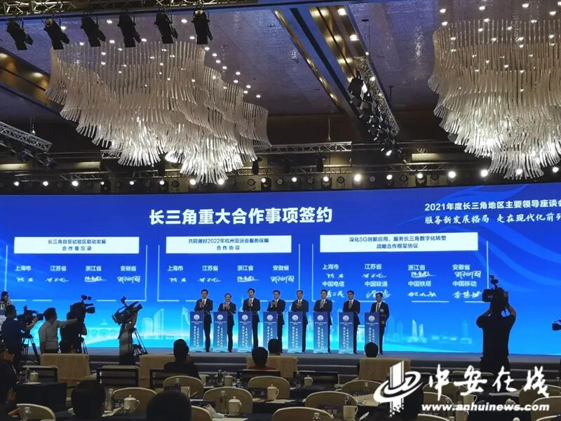 在长三角一体化发展重大合作事项签约仪式上,现场共同签署了《长三角自贸试验区联动发展合作备忘录》《共同做好2022年杭州亚运会服务保障合作协议》《深化5G创新应用,服务长三角数字化转型战略合作框架协议》《长三角企业家联盟、研究型大学联盟战略合作协议》和《共同建设环太湖科创圈战略合作框架协议》。