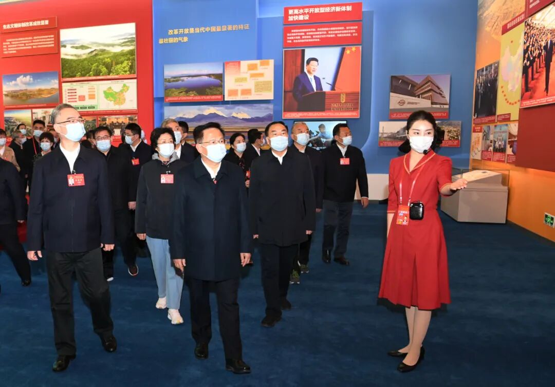 晚上8时许,安徽省代表团来到精心布置、气氛喜庆的北京展览馆,走进展厅参观展览。展览设序厅、中央综合展区、地方展区、展望展区、室外展区和互动展区6个展区,面积超过3万平方米,运用图片、实物、模型等6000多项展览要素,角度丰富、内涵饱满。展览紧扣“奋进新时代”这一主题,以党的十八大以来以习近平同志为核心的党中央治国理政为主线,聚焦新时代10年党和国家事业的伟大成就、伟大变革,全面展现了党和国家事业发展的新局新貌及新时代中国共产党团结带领广大人民群众干事创业的良好风貌,揭示了历史性成就和历史性变革背后的力量和动能。郑栅洁、王清宪等认真听取解说员讲解,细看“奇迹号”帆船造型雕塑和芜湖市繁昌区平铺镇的孩子们欢度“六一”儿童节、合肥市淝南社区居民使用智能垃圾分类回收柜投放垃圾等图片,驻足观看2020年8月19日习近平总书记在马鞍山市考察的照片,重温习近平总书记考察安徽重要讲话指示精神。在安徽展区,郑栅洁、王清宪等仔细察看记录安徽新时代10年来沧桑变化的实物模型、视频和图片图表,欣喜于安徽作风建设、暖民心行动等取得的实效。