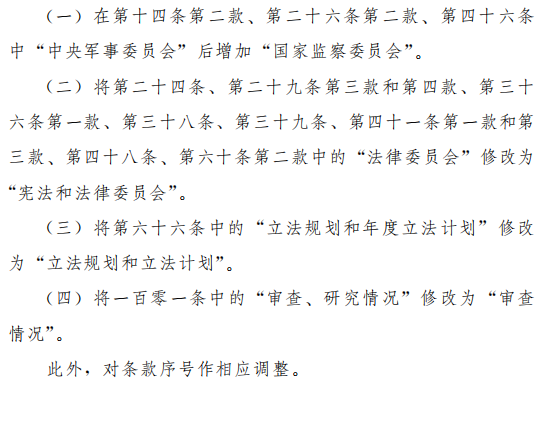 修正草案将现行立法法第三条修改为:立法应当坚持中国共产党的领导,坚持以马克思列宁主义、毛泽东思想、邓小平理论、“三个代表”重要思想、科学发展观、习近平新时代中国特色社会主义思想为指导,建设中国特色社会主义法治体系;将现行立法法第四条修改为:立法应当符合宪法的规定、原则和精神,依照法定的权限和程序,从国家整体利益出发,维护社会主义法制的统一、尊严、权威。