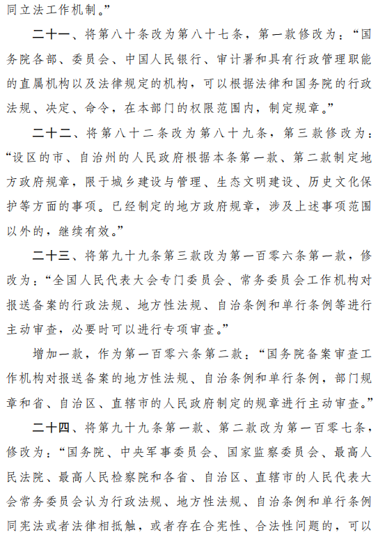 修正草案修改现行立法法第九十九条第三款并单列一条,第一款规定:全国人大专门委员会常委会工作机构对报送备案的行政法规、地方性法规、自治条例和单行条例等进行主动审查,必要时可以进行专项审查;增加一款,作为第二款:国务院备案审查工作机构对报送备案的地方性法规、自治条例和单行条例,部门规章和省、自治区、直辖市的人民政府制定的规章进行主动审查。
