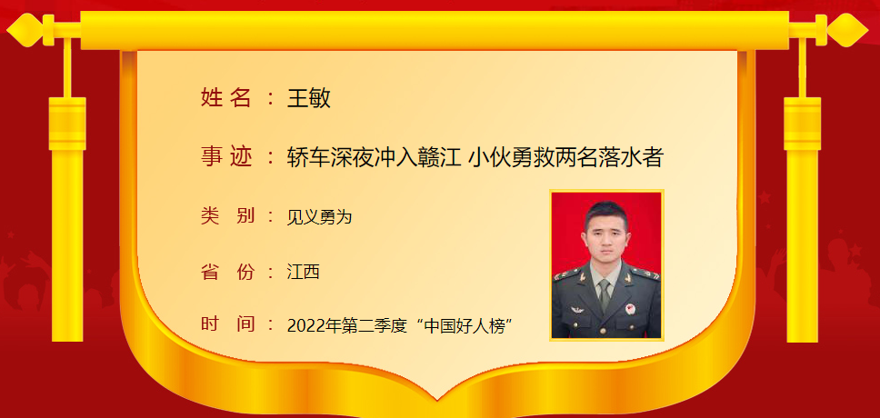 王敏,男,1993年8月出生,中共党员,吉安市泰和县人,新疆喀什解放军某部三级士官。2022年3月9日凌晨3时40分许,一辆轿车撞断路边的护栏,直接飞进赣江河里。面对突发险情,他挺身而出、临危不惧、生死救援,从4米高的河堤跳入冰冷的江水中,2次入水,连救2人,彰显了“人民子弟兵为人民”的初心本色。他曾获得“优秀士兵”“优秀士官”等称号,2017年荣立三等功。