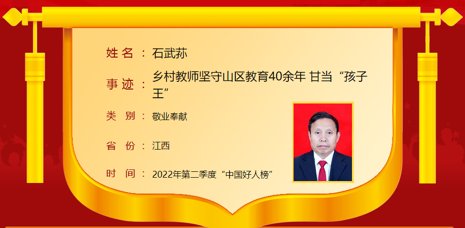 石武荪,男,1962年5月出生,中共党员,抚州市黎川县华山镇华联村小教师。他数次放弃进城机会,扎根偏远山区,默默坚守在离县城30多公里的大山里40多年,无怨无悔地守候着村级小学简陋的三尺讲台,把自己的青春年华无私地奉献给了山里的百姓和孩子们,用忠诚和责任诠释了一名农村党员、一名教师真正的生命价值。他曾获得“全国模范教师”“江西省模范教师”等称号。