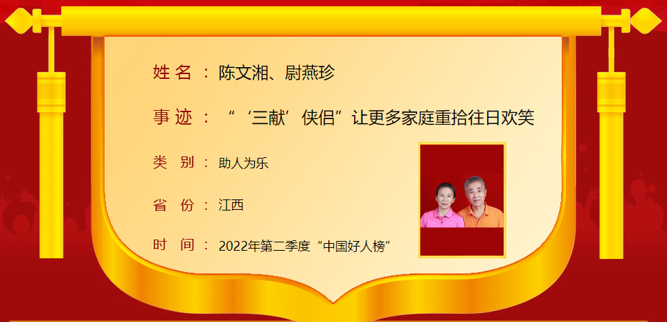 陈文湘,男,1956年12月出生,江西省鹰潭市邮政局退休职工。尉燕珍,女,中共党员,1963年2月出生,江西省南昌铁路局赣州工务段退休干部。夫妻两从事红十字会“三献”(无偿献血、造血干细胞捐献、遗体器官捐献)志愿服务,陈文湘累计志愿服务时间超过2500小时,累计无偿献血47次、献血量达16800毫升。在他的影响下,妻子尉燕珍也加入了志愿者行列,夫妻两携手志愿、倾情奉献,被人们亲切地称为“‘三献’侠侣”。