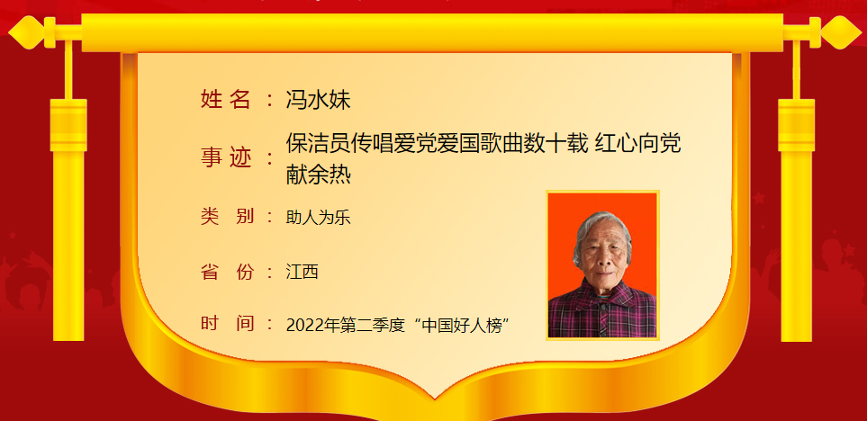 冯水妹,女,1941年6月出生,中共党员,萍乡武功山风景名胜区麻田镇大江边村村民。81岁高龄的她仍发挥余热,义务兼任中国工农红军湘东独立师陈列馆保洁员、红歌队队长。无偿打扫卫生,为游客唱红歌,她用独特的方式继续发挥余热,推动移风易俗,为党的事业贡献力量。她曾获得“省、市‘三八红旗手’”“最美萍乡人”“萍乡好人”“武功山风景名胜区优秀共产党员”等称号。
