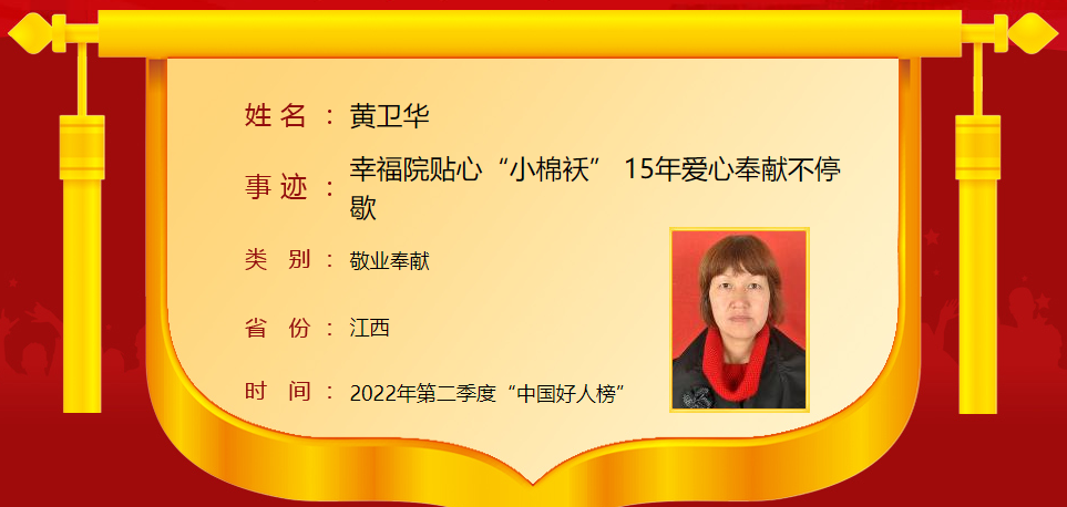 黄卫华,女,1972年10月出生,宜春樟树市经楼镇敬老院院长。她15年如一日,以敬老院为家,用爱心、善心、孝心善待院中的每位老人,像“亲生女儿”一样,真心实意、尽其所能为院内老人“尽孝”。她先后融资430余万元,对养老院进行了三次搬迁改造升级,建起了一个全省一流的乡镇幸福院。她曾获得“全国孝亲敬老之星”“江西省最美敬老院院长”“江西省十大养老护理标兵”等称号。