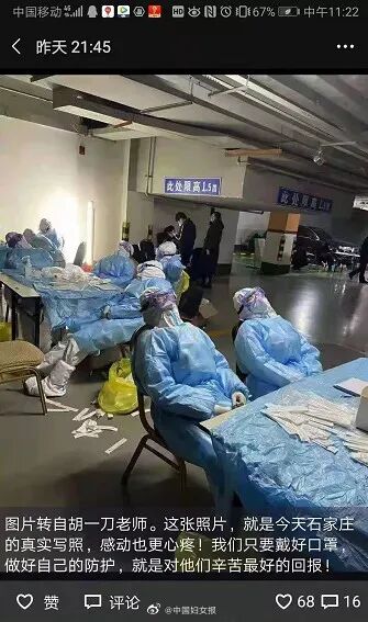 “打开朋友圈,看到这些真的特别感动。寒冷的大环境被36度的个人体温温暖着,3天1160万人做完核酸检测,中国速度!我在石家庄,我不怕,我更爱我的国,更爱我的家。”