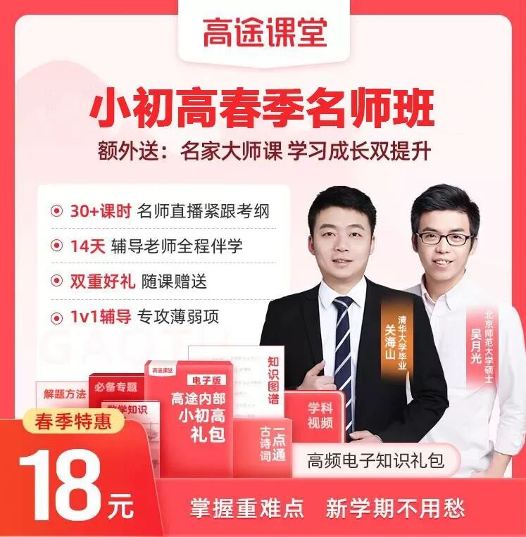 这次,周帅老师联合高途课堂一起打造的“名师火箭提升班”,致力于通过20多位毕业于清北名校的优秀教师,通过为期2周16节课的系统训练,帮所有学员掌握到适合自己的高分方法体系、解题技巧。如果你的孩子每天都在为逆袭努力,做题熬到深夜,成绩却不见涨,对未来越来越迷茫……不妨赶快让他加入“名师火箭提分班”,快速帮他掌握优秀的学习思维,掌握黑马逆袭的底层逻辑!📕高中:数学+英语+物理+语文= 原价499元=现价仅18元📗初中:数学+物理+英语/语文= 原价499元=现价仅18元高途课堂“名师火箭提升班”已经开到第122期,累计帮助过全国数百万学生和家长。哪怕孩子基础不扎实,也能帮他一步一步地解决问题,帮他取得系统提升。从0开始,构建出专属于学生的系统方法体系,助力孩子向名牌大学进发。以高中为例,优选全国前0.1%的一线教学名师组成高中牛师天团,包括清华、北大毕业名师、教育部十二五规划课题参与人、衡水中学学科组长、全国百强高中骨干教师的高考专家!老师们拥有平均15年的高考研究经验,连续多年潜心研究高考命题思路,多年押中高考相似题,深谙高中应试技法!授课时间平均15800小时,重点指导学生平均分624,半数学生考入北大、清华等985/211院校。利用高效学习法,帮你直击重难点,真实做到“学一题,会一类题”!助你跳出题海,直接冲刺600分!高途课堂为美股上市在线教育机构“跟谁学”旗下,专注K12在线教育的机构。2019年荣获用户满意在线教育机构、影响力教育品牌等荣誉。