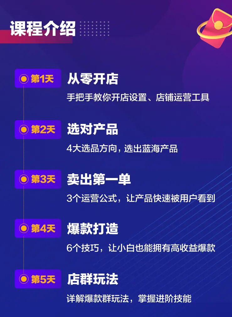 想答:低成本,只要一台手机一个支付宝,就能闪电开店营业。答:不需要,老师会教你找到货源网站和优质产品,不需要囤货压货。答:不需要发朋友圈!不需要打广告!淘宝平台有大量的免费流量!1. 保姆式教学,2022新风口:淘宝卖货的各种系统操作:从注册开店、包装定位、数据化选品、“无货源”玩法、引流成交到打造私域流量等都会教给你。2. 淘宝各种变现方法,老师会系统化地实操演示授课,一边学习一边操作,就有机会轻松挣钱。3. 没有经验,也能参与课堂学习。上手快,易学习。4.开创数据化的手法精选商品,打造爆款,曾有单店开业当天营业额就过万元。结尾再说一句:当钱不再是问题,你将会拥有更广阔的世界和更自由的人生,但前提是——你一定要开始!