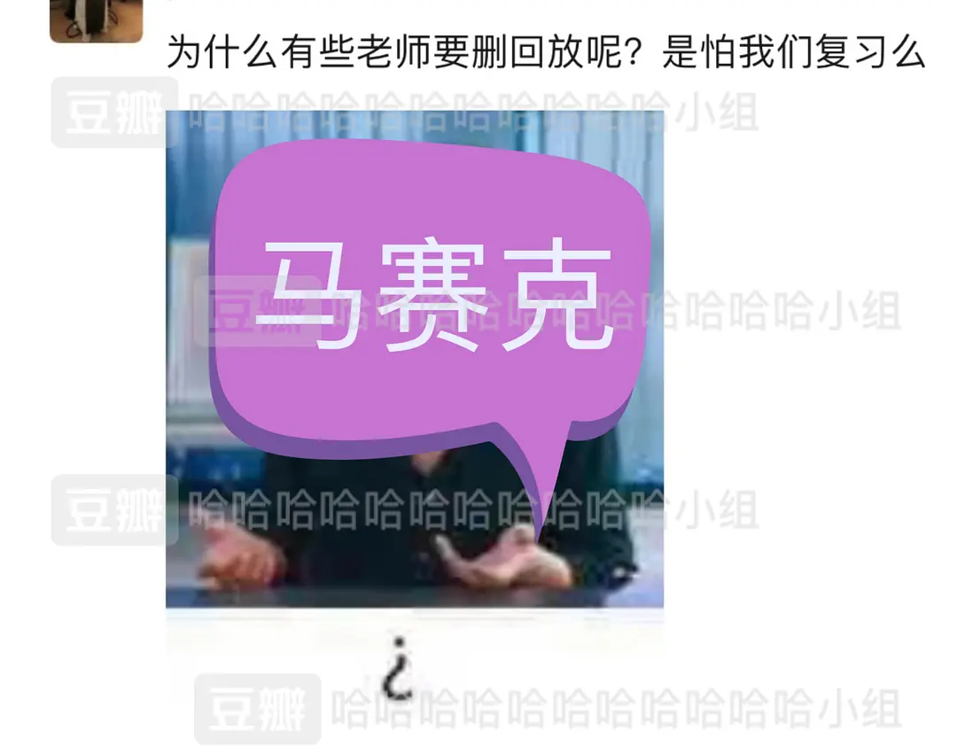 所以对于某些信奉早死早超生的朋友来说,他们还真恨不得只有一次机会,来个痛快的了结,甩手放暑假。说到底,不管是体育还是实操,这些课程本就不适合以线上的方式进行检验。同学硬着头皮考,老师耐着性子看的最终结果,就是当事人痛苦不堪,旁观者哭笑不得。但能让人抓狂的可不止这些线上水土不服的考试,平常看着普通的书面考试,转到线上之后也能累得人够呛。记不住任课老师,没翻开过书,一学期的知识积累约等于零,什么都需要临时补。在家复习/考试没氛围,昼夜颠倒没有时间概念,“试”到临头一点紧张感都没有。看起来,处处是坑的线上书面考试,才最考验这届大学生应付考试的能力。实操考试全靠手上功夫,可书面考试不一样,“重点清晰(?),不背不行”,线下考试该有的样子,就算改成线上也跑不了。可对于一学期浑浑噩噩,刷微博比刷牙还勤的当代大学生来说,虽然上了大半个学期的网课,但多半还不知道课本为何物。一方面是原始课件又乱又长,短短几天根本看不完,更别提背下来了;另一方面,你真的不知道,表面不动声色的老师什么时候会偷偷来一场恶作剧般的大扫除,直接毁掉无数人复习的唯一指望;豆瓣哈组@ 兔兔兔兔图/或许老师只是觉得视频里的自己不好看吧