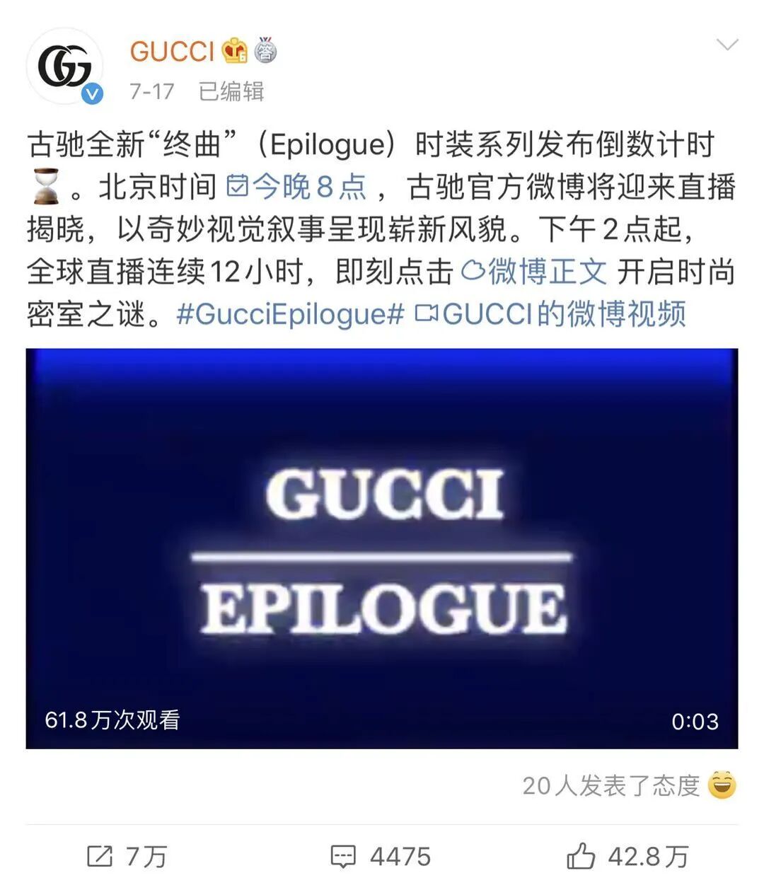 图 / Gucci 举办了一场长达12小时的时装直播秀在微博的总播放量超过1570万次。
