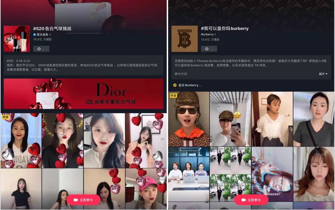 图 / Dior在抖音平台制作的话题 #520告白气球挑战 播放量已达到10.3亿次,Burberry制作的话题 #我可以盘你吗 两个月内播放量突破13.6亿次。