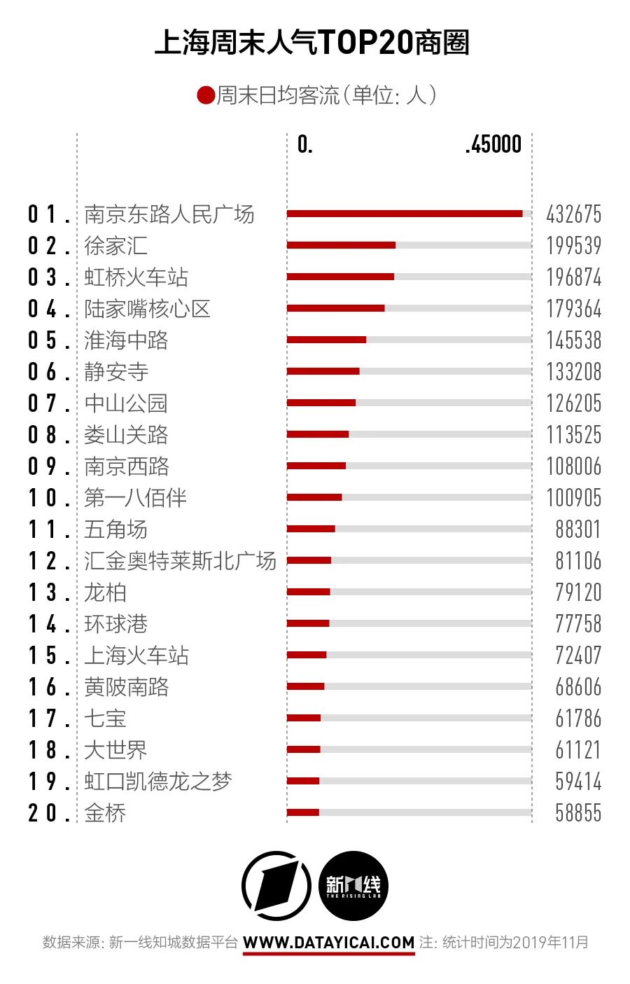 从绝对数值上看,市中心核心商圈依然是客流最多的地方。南京东路人民广场一带毫不意外地占据着绝对人数优势,2019年11月的周末,南京东路人民广场商圈每天平均有超过40万人到访,客流量超过徐家汇商圈的2倍。