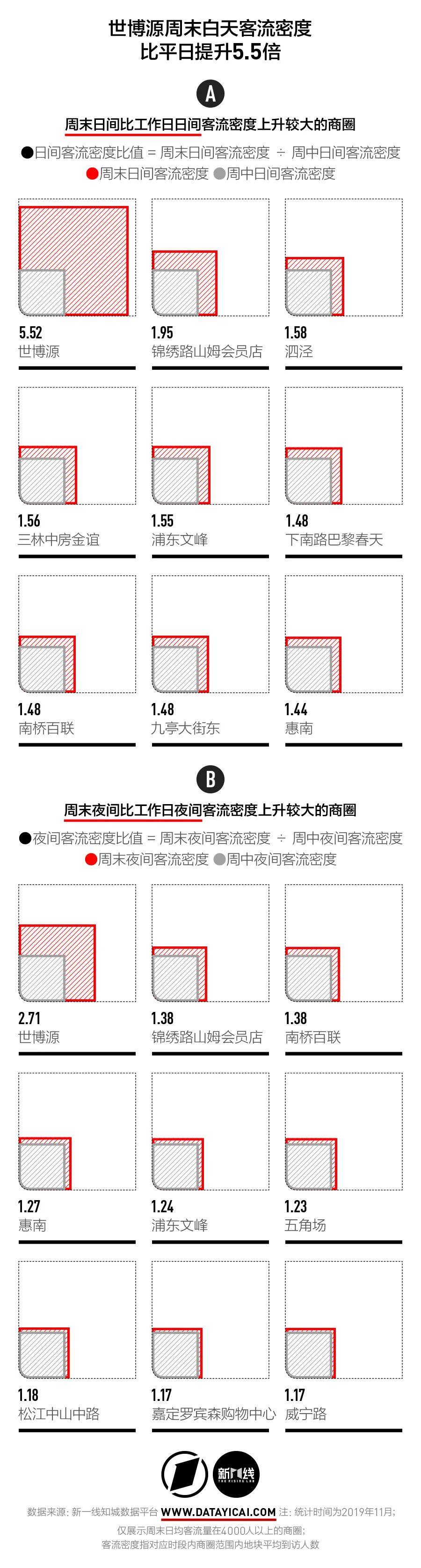 在上海,298个商圈加起来的周末逛街总人数比平日约多出18.4%,而平均每个商圈周末日均客流量比工作日增加19.7%。徐家汇、陆家嘴都在这个基准线附近。
