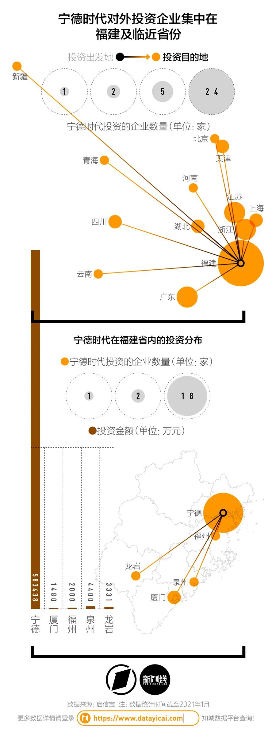 截至2020年年末,宁德时代在全国投资企业数量已经达到了52家,这些投资集中在福建省内城市,以及广东和浙江等临近省份。