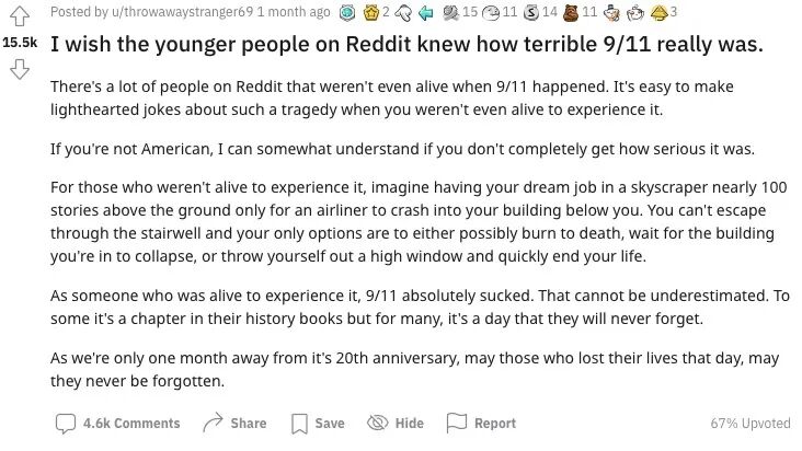 美国论坛reddit上,有人写道:“我希望reddit上的每一个年轻人都知道20年前的今天(911事件)有多恐怖”,目前,已经有大量的回应和互动。