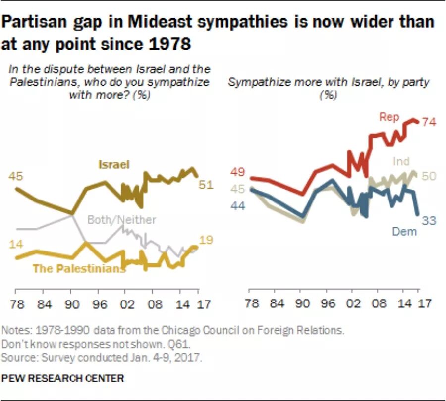 皮尤研究所在2017年1月公布一个报告,显示美国党派政治的两极化造成对以色列态度的改变。