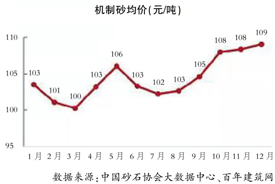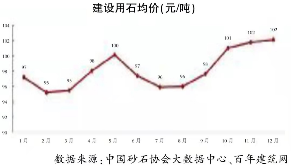 2021年下半年,随着砂石市场的供需变化,价格一路上扬。截至12月31日,碎石均价102元/吨,环比持平。