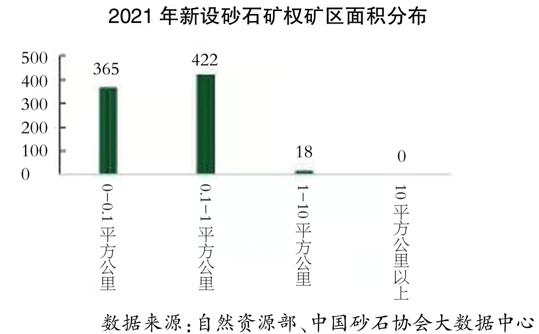 2021年砂石行业规模化发展已经取得了一定成效,0.1~1平方公里矿权取代0~0.1平方公里矿权,成为2021年新设矿权的主流。2021年,新设砂石矿权中,矿区面积在0~0.1平方公里之间的有365个,占比为45.3%,占比较2020年已有0~0.1平方公里砂石矿权(62.5%)有所下降;矿区面积在0.1~1平方公里之间的砂石矿权有422个,占比超过一半;1~10平方公里之间的有18个,占比为2.2%。