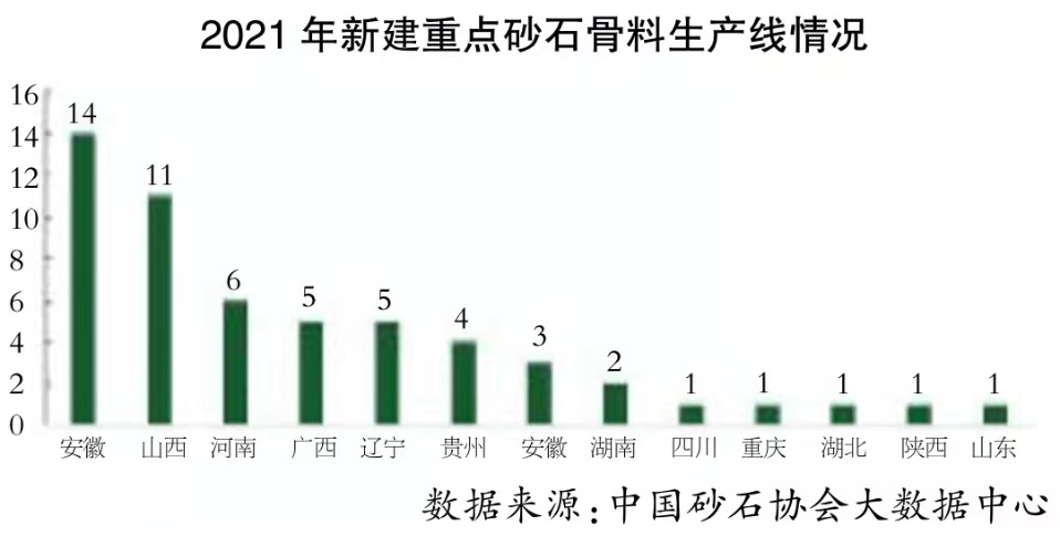 2021年,从各省新建重大骨料生产线的情况来看,福建、山西新建骨料生产线超过10个;河南、广西、辽宁、贵州、安徽、湖南新建重点骨料生产线数量分别为6个、5个、5个、4个、3个、2个;四川、重庆、湖北、陕西、山东数量均为1个。