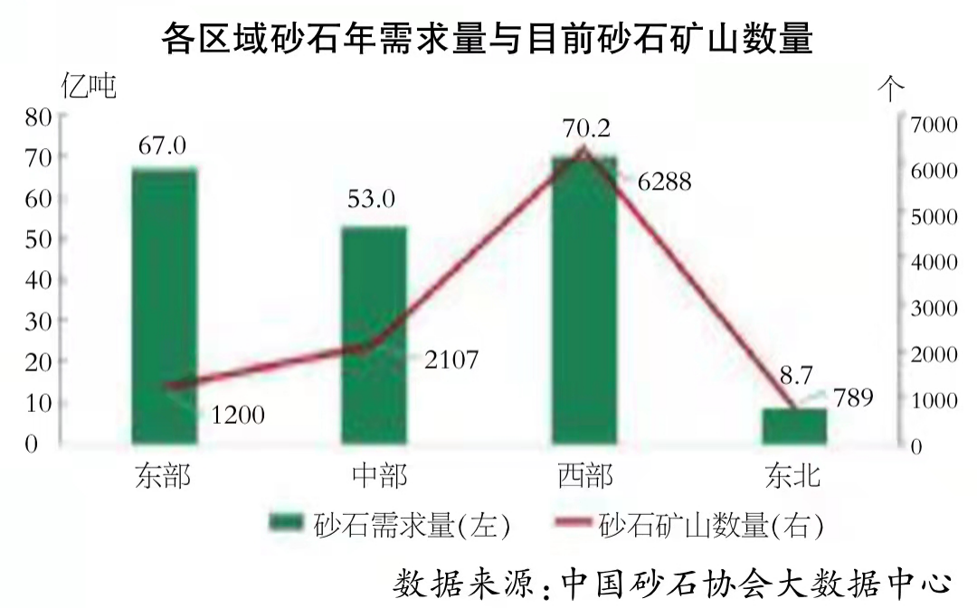西部地区:砂石矿数量为6288个,砂石需求量超70亿吨。其中,贵州目前规划产能超15亿吨,全省普遍存在产能过剩的问题。甘肃砂石需求量约3亿吨,每年自产砂石(包括河砂及砂夹石) 约3.4亿吨,供需平衡。重庆目前砂石需求约4亿吨,供需基本平衡。